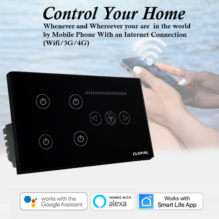 Clopal 4 Gang + Fan Dimmer Black Smart Touch WIFI Switch Series with Mobile Control, Voice Control Compatible with ALEXA, Google Assistant and IFTTT